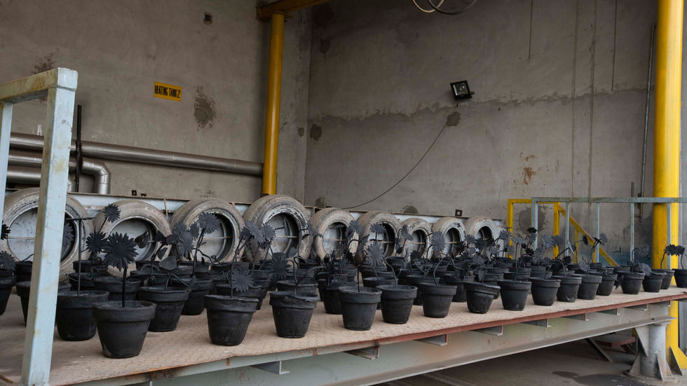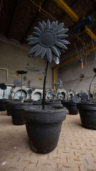 The artist took inspiration for Against the Sun from the factory itself, where these artworks were displayed and tried to capture the loss of identity in mass production by replicating sunflowers in rubber and arranging them in a grid layout. The artist produced the flowers using rubber in black. Each flower and its petals were glued by hand to give them unique characteristics.
